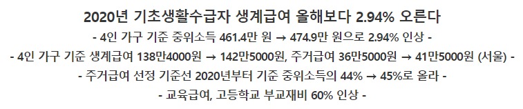 2020년 기초생활수급자 생계급여 올해보다 2.94% 오른다.