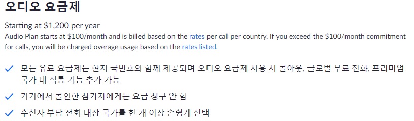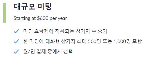 참가자를 늘려야 하거나 녹화등의 더 많은 기능을 이용하기 위해서는 유료결제가 필요합니다. 다음의 링크를 통해 연간 청구요금과 기능을 확인하실수 있습니다.