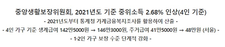 그에따라 2021년 기초생활수급자 생계급여가 올해 대비 내년에는 4인가구 기준 2.68% 인상돼 142만4,752원에서 146만2,887원으로 인상·보장수준이 강화되어 국민의 최저생활을 보장하고 자활을 돕게됩니다. 1인 가구 기준으로는 52만7158원에서 54만8349원으로 인상된 금액입니다.